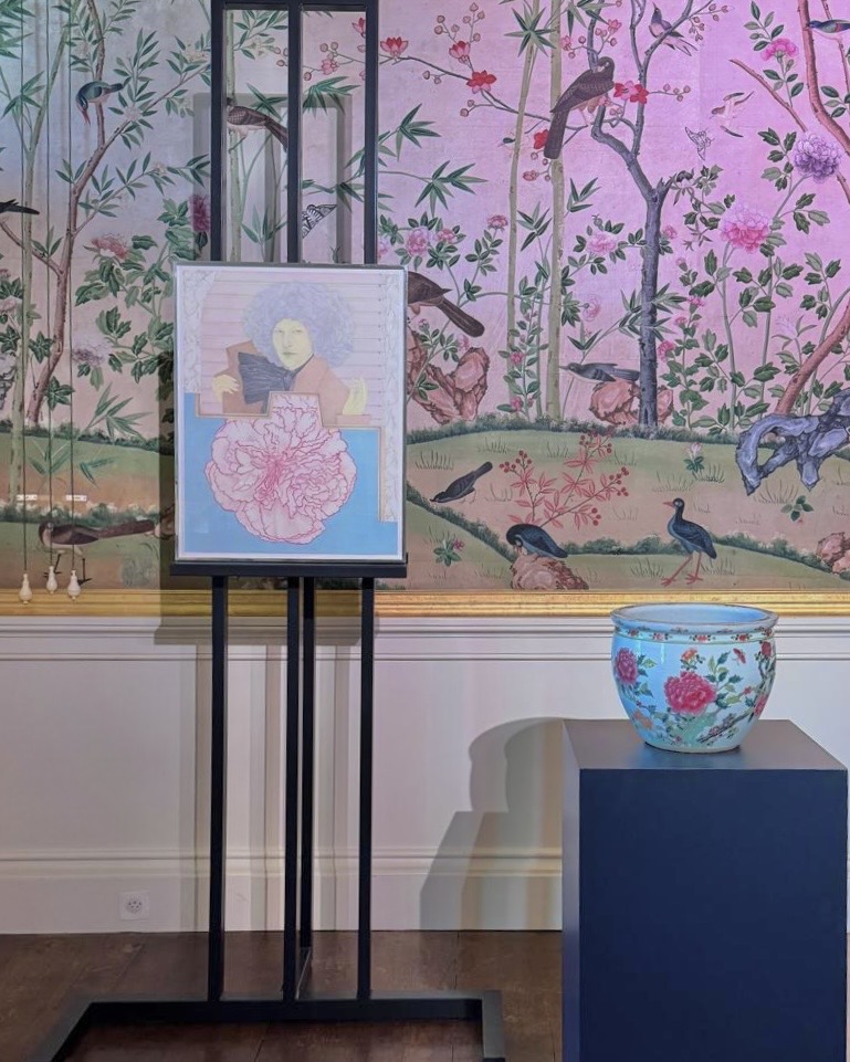 The Katrin Bellinger Collection has loaned the 2021 drawing Personal Development (fig. 1) by Donna Huddleston, which is beautifully presented on an easel in the house (fig. 2). Huddleston’s ethereal caran d’ache and graphite drawing depicts a figure in front of Venetian blinds; a compositional frame separates the figure from a large pink flower. Although the work is not a straightforward self-portrait, the woman stands for the artist herself in a theatrical and performative way. The delicate color palette of yellow-greens, pinks, and blues is suggestive of botanical watercolors, and the textured flatness of the flower evokes pressed flowers—which are also displayed in the Chatsworth exhibition.